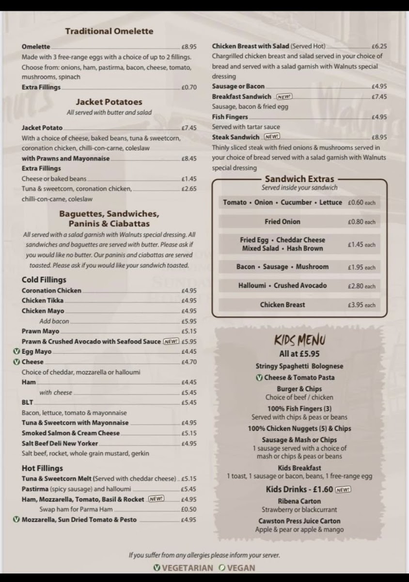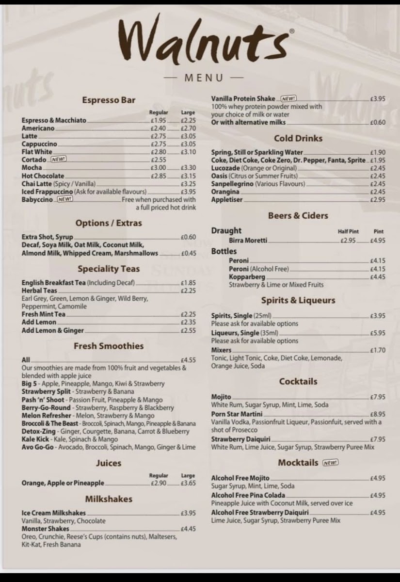 Families will appreciate the extensive Kids Menu, featuring favorites like Stringy Spaghetti Bolognese and 100% Chicken Nuggets, with options designed to please every little palate. Whether it's the delicious meals or the refreshing drinks—such as the ever-popular Birra Moretti on draught—Walnuts Café offers a wide array of choices that cater to all tastes.